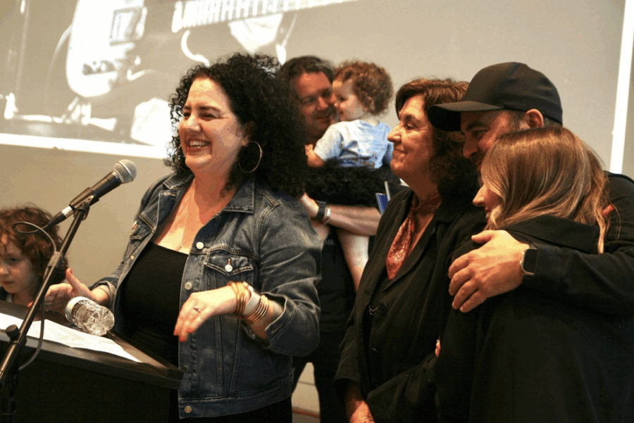 Angelene Ripley Wright, surrounded by family, speaks at the Steve Ripley